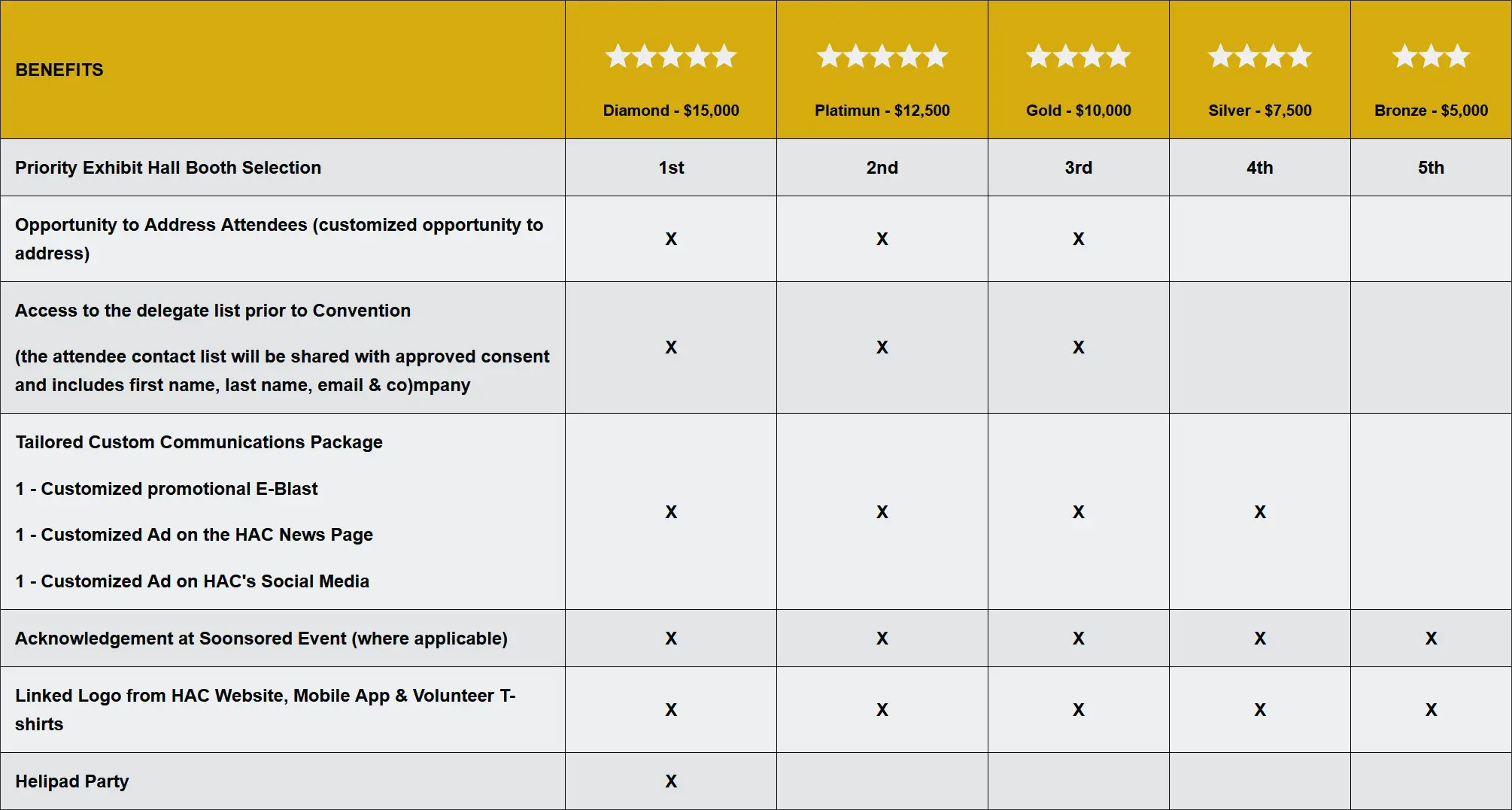 Our sponsorship packages are designed to offer visibility, brand alignment, and targeted engagement with key industry stakeholders during the HAC 31st Annual Convention & Tradeshow. Each tier includes a variety of benefits to suit different marketing goals and budgets.